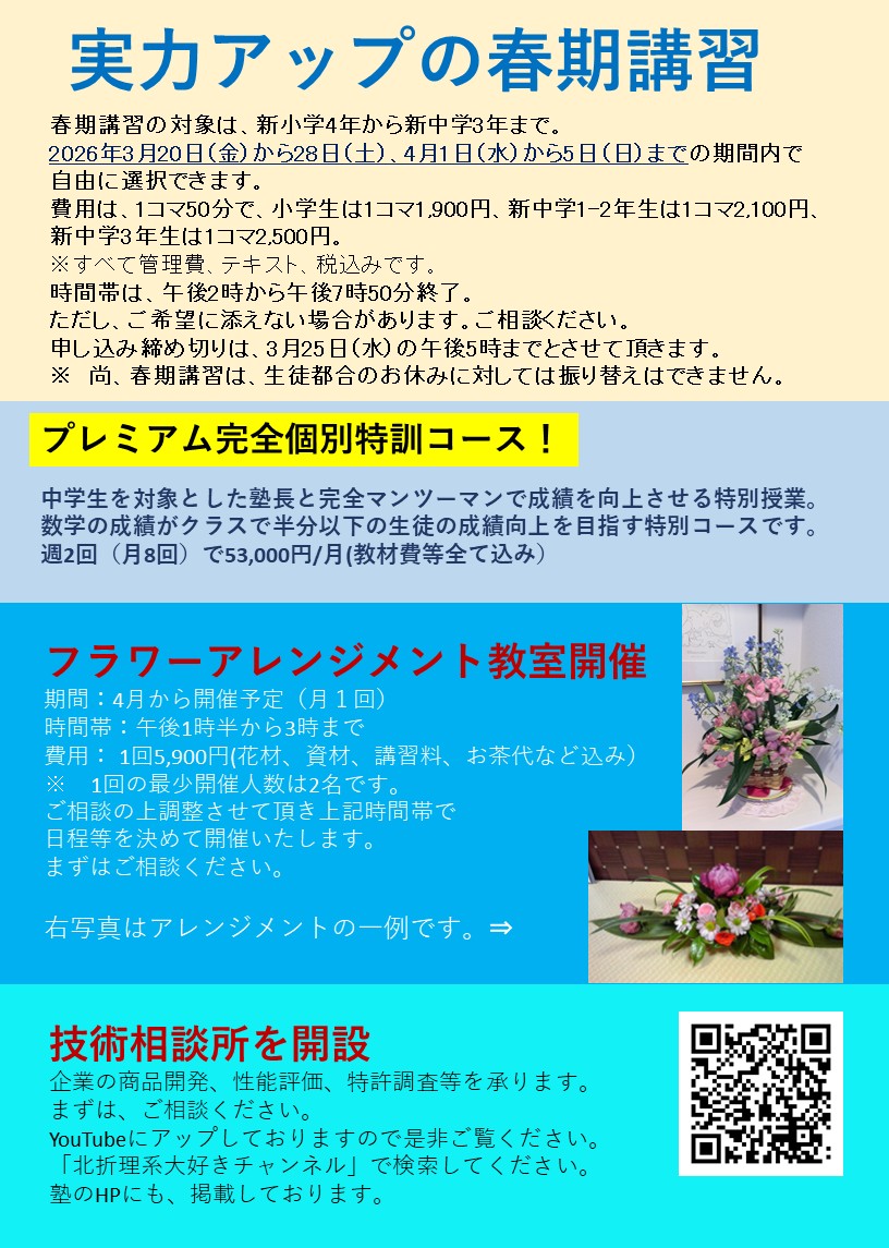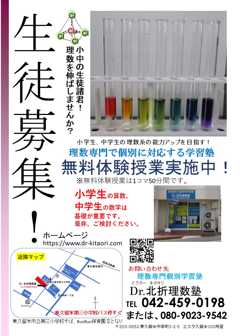 お知らせ: 2025年4月から高校生の新規生徒の募集は高校2年生までとさせて頂きます。また、完全個別での対応のみとなります。ただし、現在入塾されている高校生の生徒様は現状のままとさせて頂きます。